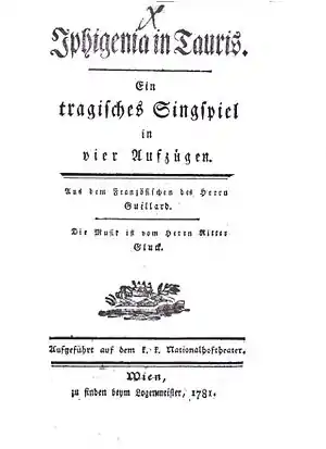 In 1781 Gluck produced a German version of the opera, Iphigenia in Tauris, for the visit of the Russian Grand Duke Paul to Vienna, with the libretto translated and adapted by Johann Baptist von Alxinger in collaboration with the composer. Among the major changes was the transposition of the role of Oreste from baritone to tenor and the replacement of the final chorus of Act 2 with an instrumental movement.[2][3] The revised version was the only opera Gluck wrote in German,[4] and his last work for the stage. Styled "a tragic Singspiel", it was staged on 23 October 1781 at the Nationalhoftheater,[5] as the emperor Joseph II had had the Burgtheater renamed after dismissing the Italian singers and their orchestra in 1776 and installing German actors in the theatre. When the meagre results achieved by the new Singspiel programmes[6] led the emperor to back down, getting an Italian opera buffa company recruited again and engaging Lorenzo Da Ponte as his theatre poet,[7] the latter was charged to prepare an Italian translation of Gluck's opera, which was staged in the restored Burgtheater, on 14 December 1783.[8] According to Irish tenor Michael Kelly's "reminiscences" this production, too, was personally supervised by Gluck.[9] The German edition was revived in Berlin at the former Königliches Nationaltheater in the Gendarmenmarkt on 24 February 1795,[10] while Da Ponte's translation was chosen for the London first performance at the King's Theatre on 7 April 1796.[11] The original French version eventually proved to be one of Gluck's most popular composition in Paris: "it was billed on 35 dates in 1779, and it went on to enjoy more than four hundred representations in 1781–93, 1797–1808, 1812–18, 1821–23, 1826–28, and 1829.[12] It was mounted at the Châtelet (1868),[13] the Renaissance (1899), and the Opéra-Comique (1900). It was brought to the stage of the present opera house in Paris on 27 June 1931 with the aid of the Wagner Society of Amsterdam and with Pierre Monteux conducting the orchestra".[14]