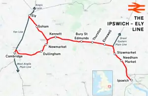 The Ipswich–Ely line is a railway line linking East Anglia to the English Midlands via Ely. There is also a branch line to Cambridge. Passenger services are operated by Abellio Greater Anglia. It is a part of Network Rail Strategic Route 5, SRS 05.07, 05.08 and part of SRS 07.03.[1] The line has previously been part of the Great Eastern Main Line.