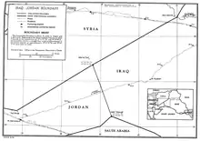 No precise boundary between the Iraq and Transjordan mandates was drawn at that time.[3] The location of the Eastern border between Transjordan and Iraq was considered strategic with respect to the proposed construction of what became the Kirkuk–Haifa oil pipeline.[7] It was first set out on 2 December 1922, in a treaty to which Transjordan was not party to – the Uqair Protocol between Iraq and Nejd.[8] It described the western end of the Iraq-Nejd boundary as "the Jebel Anazan situated in the neighbourhood of the intersection of latitude 32 degrees north longitude 39 degrees east where the Iraq-Najd boundary terminated", thereby implicitly confirming this as the point at which the Iraq-Nejd boundary became the Transjordan-Nejd boundary.[8] This followed a proposal from T.E.Lawrence in January 1922 that Transjordan be extended to include Wadi Sirhan as far south as al-Jauf, in order to protect Britain's route to India and contain Ibn Saud.[9]