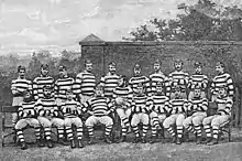 Dublin University was the first organised rugby football club in Ireland, having been founded in 1854.[2] The club was organised by students who had learnt the game while at public schools in Great Britain. During the third quarter of the nineteenth century, and following the adoption of a set of official rules in 1868, rugby football began to spread quickly throughout Ireland, resulting in the formation of several other clubs that are still in existence, including NIFC (1868); Wanderers (1869); Queen's University (1869); Lansdowne (1873); Dungannon (1873); Co. Carlow (1873); UCC (1874); and Ballinasloe (1875) which amalgamated with Athlone to form Buccaneers.[3]
