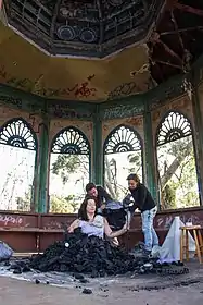 The image to the right was conducted at EPI International Performance center in Chile, 2012. It was created by Irene Loughlin and curated by Alperoa Lota. Here Irene is buried by materials from the earth and work of Lota - coal.[3] It is to resemble the industrial material that is seen with mining and as a way of heating homes. This performance art is dedicated to Isadora Goyencha, as a relation to herself and women in the community of Lota.[3] Irene speaks of this piece as also being a resemblance of her own life living in the industrial steel city of Hamilton.[3]