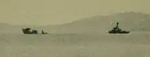 When the two submarines arrived they were off Mendoza Island (now Shenggao Island) at the entrance of the bay. The two then split up. L4 went to patrol around the entrance of the bay and Halahan ordered L5 to patrol within. Bias Bay is surrounded by rocks and that night there was a fleet of fishing junks sheltering inside and constantly moving around the anchorage. Both the rocks and the junks made it difficult for the British to monitor the area without being detected, though they succeeded in doing so, and on the morning of 20 October they encountered Irene steaming off Cake Island. She had been taken over by at least eighteen pirates armed with automatic pistols. It was still dark so L4 was surface cruising with one crew at the 4-inch (102 mm) gun and another at the vessel's searchlight. Lieutenant Halahan knew that torpedoes were not helpful in recapturing a pirate-held ship but he did have a 4-inch deck gun. Then Irene was spotted so Halahan maneuvered his submarine into position for firing, and when the order was given, the search light was turned on and the gun crew fired a blank warning shot at the steamer. When the shot was ignored a second, live round was fired and it blew a hole straight through the ship and killed a pirate who was standing on deck.[4]