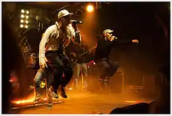 According to their own statement, Irie Révoltés aim at denouncing social ills while spreading positive energy with their music. They wants to encourage change through their socio-political engagement.[6] Amongst other things, they support the project “Respekt!”,[7] which fights against prejudice, racism, homophobia and sexism“ and are activists of “Viva con Agua de St.Pauli”, an association that works to bring clean drinking water to the “global South”. Songs as Viva con Agua and Walk with Us (ft. Gentleman) were written in order to make the concerns of the association heard. Irie Révoltés are also committed to individual actions.[8] In autumn 2009, the band appeared several times during the Bildungsstreik (student mobilization) and supported the protest together with Chaoze One offering a song for free-download. To promote the initiative “Kein Platz für Rassismus” ("No Place for Racism"), which took place in Frankfurt, Irie Révoltés have written the song Viel zu tun (There's still much to do). Focus of their social commitment is “Rollis für Afrika”, brought into being by the front man Mal Élevé in 2003 in order to help people with disabilities in Senegal. The band promotes the project organizing charity concerts, information stands and through targeted actions.[9] In spring 2012, Mal Élevé and Carlito were appointed members of the jury that first awarded the Youth Peace Prize of the German Association for the United Nations (DGVN). The prize acknowledges and promotes the engagements of young people in issues concerning the United Nations.[10]