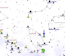 The nebula, which shines at magnitude +6.8, is illuminated by a magnitude +7.4 star designated SAO 19158.[1] It is located near the Mira-type variable star T Cephei, and near the bright magnitude +3.23 variable star Beta Cephei (Alfirk). It lies 1,300 light-years away and is six light-years across.[2]
