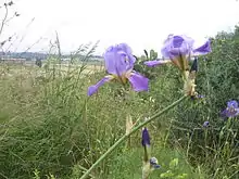 Iris mesopotamica, the Mesopotamian iris, is a species in the genus Iris, it is also in the subgenus Iris. It is a rhizomatous perennial, from the middle East, within the countries of Iraq, Turkey, Syria and Israel. It has linear, grey-green or green broad leaves, tall stem with 2–3 branches, holding up to 9 scented flowers, in shades of violet, purple, lavender blue and light blue, with a yellow and white or orange and white beard. It is listed as a synonym of Iris germanica in some sources. It is cultivated as an ornamental plant in temperate regions, including being planted in graveyards and cemeteries.