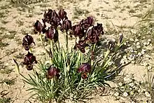 Iris petrana, the Petra iris, is a species in the genus Iris, it is also in the subgenus of Iris and in the Oncocyclus section. It has spring blooming flowers that come in shades from burgundy, dark brown to dark violet and purple. They have yellow or dark 'beards' and flower over sword-like grey-green leaves. It is normally found in the desert sands between the countries of Jordan and Israel.