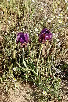 Within the Yeruham Iris Nature Reserve, it grows with mounds of Echiochilon fruticosum, the blue Siberian lily Ixiolirion tataricum and a hyacinth relative called Leopoldia longipes subsp. negevensis.[10] It is normally found in groups of plants, with 20 or more flowers, all blooming at the same time.[3]