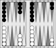 - Second variation. This is the same as modern backgammon. If the points are numbered from 1 to 12 on the player's side of the board and 13 to 24 on the opponent's side (see diagram), then each player places 5 men on point 6, 3 on point 8, 5 on point 13 and 2 on point 24.