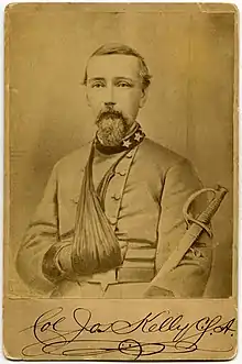 Although significantly fewer Irish lived in the Confederate States of America,[8] six Confederate generals were Irish-born, of whom Patrick Cleburne was the highest ranking. Units such as the Charleston Irish Volunteers[9] attracted Confederate Irish-Americans in South Carolina, the 24th Georgia Volunteer Infantry followed General Thomas Reade Rootes Cobb, while Irish Tennesseans could join the 10th Tennessee Infantry Regiment. A company of the Washington Blues regiment of the Missouri Volunteer Militia (later the Missouri State Guard), commanded by Colonel Joseph Kelly, was the subject of a Confederate song, "Kelly's Irish Brigade".[10] The Louisiana Tigers, first raised by Major Chatham Roberdeau Wheat, had a large number of Irish American members. Company E, Emerald Guard, 33rd Virginia Infantry of the Stonewall Brigade composed of Irish immigrant volunteers may have been first to make the infamous "rebel yell" at 1st Bull Run, attacking 14th New York guns on Henry Hill. The Davis Guard, a company of mostly Irish-American men from the Houston and Galveston area, won a lopsided victory Second Battle of Sabine Pass in 1863. They received the only physical medals awarded by the CSA, made from polished Mexican silver coins and hung from green ribbons to honor their Irish heritage.[11]