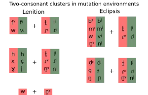 In the environment of an initial consonant mutation, there is a much wider range of possible onset clusters;[59][60] for example, in a lenition environment the following occur: bhlas /wl̪ˠasˠ/ ('tasted'), bhris /vʲɾʲɪʃ/ ('broke'), chleacht /çlʲaxt̪ˠ/ ('practiced'), chrom /xɾˠɔmˠ/ ('bent'), ghreamaigh /ˈjɾʲamˠə/ ('stuck'), ghníomhaigh /ˈjnʲiːwə/ ('acted'), shleamhnaigh /hlʲəun̪ˠə/ ('slipped'), shnámh /hn̪ˠaːw/ ('swam'), shroich /hɾˠɪç/ ('reached'). In an eclipsis environment, the following are found: mbláth /mˠl̪ˠaː/ ('flower'), mbliana /ˈmʲlʲiən̪ˠə/ ('years'), mbrisfeá /ˈmʲɾʲɪʃaː/ ('you would break'), ndlúth /n̪ˠl̪ˠuː/ ('warp'), ndroichead /ˈn̪ˠɾˠɔhəd̪ˠ/ ('bridge'), ndréimire /ˈnʲɾʲeːmʲəɾʲə/ ('ladder'), ngléasfá /ˈɲlʲeːsˠaː/ ('you would dress'), ngreadfá /ˈɲɾʲat̪ˠaː/ ('you would leave'), ngníomhófá /ˈɲnʲiːwoːhaː/ ('you would act').