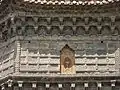 This octagonal-base structure stands at a current height of 56.88 meters (186.56 feet), with a total of 13 stories.[1] It is a solid-core brick tower with an inner spiral stone staircase and outside openings to allow light and air flow.[2] The architectural style features densely positioned, articulated dougong in the eaves (miyan) and multiple stories (louge).[2] The exterior features more than fifty different varieties of glazed brick and 1,600 intricate and richly detailed carvings, including those of standing and sitting Buddha, standing monks, singers and flying dancers, flowers, lions, dragons and other legendary beasts as well as many fine engravings. Under the eaves are 104 bells that ring in the wind. The foundation rests in the silt of the Yellow River.[3] Inside the Iron Pagoda are frescos of the classical Chinese tales, such as The Journey to the West.[4]