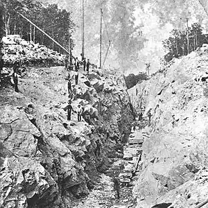 The terrain for the line proved forbidding. The country was hilly and broken; grading the roadbed proved an expensive and intensive activity. By June 1891 an initial workforce of 500 men had swelled to 1,500, which strained the local transportation network. The builder, Wallace Dingman of Battle Creek, Michigan, ran out of money in August and abandoned work, leaving the IR&HB with unpaid bills and swamping Marquette County's limited poor relief resources.[7] New contractors were hired and the grading was finally finished in the summer of 1892, reportedly at the cost of $400,000–well above the $265,000 budgeted for the project. One major obstacle was a 1,000-foot (305 m) cut near Mount Arvon, from which 40,000 cubic yards (31,000 m3) of rock were removed. The rails were laid between July and November 1892.[8]