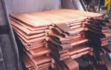 Electrodeposited copper adheres quite firmly to the stainless steel so that it does not detach during refining.[12] The vertical edges of the stainless steel plates are covered with tight-fitting polymer edge strips to prevent copper depositing around the edge of the cathode plate and so make it easier to strip the cathode copper from them.[12] The bottom of the cathode plates were masked with a thin film of wax, again to prevent the copper depositing around the bottom edge.[3] Wax was used rather than an edge strip to avoid having a ledge that would collect falling anode slimes and contaminate the cathode copper.[3]