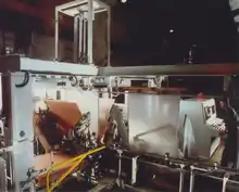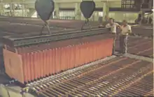 The original cathode stripping machine was based on that used at the Hikoshima plant of the Mitsui Mining and Smelting Company of Japan.[3] However, considerable development work was necessary to modify the design to handle the copper cathodes, which were heavier than those at Hikoshima, and to process the cathode plates without damaging them.[3] The machines also had to be redesigned to allow for waxing the sides and bottoms of the cathode plates to allow the next copper cathode sheets to be removed easily.[3]