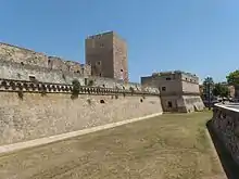 Keeping in mind her previous life experiences, Isabella made it her priority to enhance the castle's defences, ensuring that it was up to date with the form of warfare that had harmed Milan and Naples.[4] This emphasis on security turned out to be well placed. In July 1502, Gonzalo Fernández de Córdoba distributed a small portion of his forces to Bari, under Isabella's protection. This led to the French considering an attack on Isabella's Duchy, some argued it would be an advantageous way of conducting war against the Spanish. However, this was avoided when ideas of chivalry were taken into consideration.[19] Whilst Isabella may have avoided danger on the count of her gender, it was a reminder that her hold on Bari was far from secure and her gender may not always excuse her. Aside from building up defences, the situation in Milan had taught Isabella that political security was also essential; her will needed to be upheld at all times, never weakened or undermined. Therefore, she introduced more vigorous surveillance of public officials, ensuring that their notorious corruption was combated.[4]