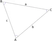 where a, b, and c are the lengths of the sides of a triangle, and A, B, and C are the opposite angles (see figure).