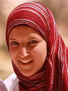 There are some Muslim women who believe that the hijab indeed hinders their personal freedom as a woman. A Muslim woman by the name of Rasmieyh Abdelnabi explains that she decided to stop wearing the hijab because she felt that it was putting too much pressure on her to "represent an entire community".[26] She further explains that she feels that hijab is not representative of Islam but more so of the Arab culture.[27][28] Another belief of some women that wear the hijab is that it could potentially "strip them of their individuality"[27] and turn them into a figurehead for their religion. Some women do not want to have to deal with this on a daily basis, and it is another reason that some Muslim women have decided to un-veil themselves. In an article written in September 2013, Nesrine Malik explains her discontent with being forced to wear the niqab, a kind of dress that only exposes the eyes, saying, "I would rather no one wore a niqab. I would rather that no woman had effectively to disappear, from a young age, because that is the norm in her family. [...] I would rather that Islam be purged of the niqab and all its permutations." Malik is among the Muslim women who feel as though the act of veiling hides women; she would like to ban the niqab from Islam.[29]