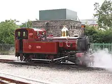 Built for the Manx Northern Railway in 1880, this locomotive was originally numbered 3, becoming 14 upon the merger with the Isle of Man Railway in 1905 but not receiving its number and chimney numeral immediately (the numerals were lost in 1956 when a replacement chimney was fitted). it was the only locomotive purchased by the Manx Northern to be built by Beyer Peacock & Co., in their Gorton Foundry in Manchester (works number 2028), and was similar in design to No. 7 Tynwald. Unique among the fleet in still being in almost "original" form, it retained it distinctive Salter safety valves until withdrawal from service in 1963 and after storage it was repainted into an approximation of it original colour scheme and placed on display at St John's station during the 1967 and 1968 seasons, and later at Douglas station. In 1978 it was sold for private preservation on the island and remained there for some time, unavailable for public viewing. In July 2021 it was photographed in the workshops of John Fowler Ltd. in Ulverston.[2]
