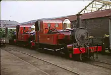 It wasn't until 1944 that the railway changed the standard livery to Indian red which is a rusty, orange colour, akin to red iron oxide or red lead. The "Indian Red" paint as produced in the railway's workshop and tended to oxidise over time. Recently repainted locomotives would be a deep red colour with a hint of orange; those that had not visited the paint shop in some time would be a reddish brown. This was lined out white-black-white, and remained standard until the 1967 re-opening when Lord Ailsa had service locomotives repainted into a fresh "spring" green livery. This was very similar to London and North Eastern Railway apple green. The story goes that the Rev. Teddy Boston, a friend of the Marquess had a 4 mm scale model of an Isle of Man locomotive that he had painted in LNER colours. This was shown to Ailsa in the spring of 1967, who liked it, and had 5, 8, 10, 11, 12 and 15 quickly repainted to match! Spring green became standard livery until nationalization, when the new Isle of Man Railways management decided to repaint the locomotives in a variety of colours to dispel the notion that there were only two engines on the line. The first so treated was No.4 Loch which appeared in a non-standard Midland Red livery for the 1979 season. Two years later No. 11 Maitland appeared in a variation on the Indian red scheme, though it briefly ran in a dull black livery after being used for the BBC production of 'The Ginger Tree' in the late 1980s. There then followed by the most bizarre incarnation of them all, a royal blue No. 12 Hutchinson complete with alleged "Mannin-Style" square cab. This was never popular with the enthusiasts and when the locomotive was reboilered in 2001 it reverted to traditional Beyer, Peacock "house" with its wrapped over front and rear plates. No. 13 Kissack appeared in Brunswick green c.1980, and remained in that livery until withdrawn in 1992. When G H Wood re-entered service in 1993 it took over from Kissack as the dark green locomotive, whilst Sunderland was out-shopped in spring green for the 1998 season.