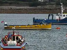- MV Tean — operated by the ISSC 1952–early 1990s. Built as a Royal Navy harbour launch number 183942, at Dickie's yard, Bangor in 1941.[21] Length 53 feet (16 m). Gross tonnage 20.65. Registered tonnage 9.30. 12ft beam. She was brought to Scilly in her original Naval state from Worcester, helmed by Clifford Jenkin, with motor engineer JT Lethbridge in attendance. Like MV Kittern, she underwent an extensive refit on Scilly, which included the replacement of her original power plant with a new L. Gardner and Sons 6 cylinder 6LW diesel engine, larger wheelhouse, the replacement of her forward cabin with a cargo hold, new funnel and the addition of high timber bulwarks.[24] She underwent another ISSC refit in 1983, which included the replacement of her timber gunwales with steel railings and a replacement 'modern' funnel. She has been in various private hands 1990s-2021. She was based in Bideford for a time in the early 2000s, and made local headlines when on passage from Bideford to Lydney, when she got into difficulties at Portishead, was refused entry into Portishead Marina, and had to be beached just outside the marina. Here she remained for several months whilst repairs were undertaken, and she eventually made it to Lydney. Her current (2021) location is Bullo Pill, off the Severn estuary.