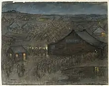 When World War I broke out some Australians, such as Rix Nicholas, fled to England, however Rae stayed and became, along with Jessie Traill, one of only two Australian women artists to portray the war while living in France. When in 1918 Australia first appointed official war artists, sixteen men were chosen; Rae, despite having lived in France for the duration of the conflict, was not included.[5] She nevertheless documented prolifically the experience of the war in her adopted home town, creating over two hundred drawings. Most of these portrayed the Étaples Army Base Camp, "the largest of its kind ever established overseas by the British", which at its zenith housed 100,000, including hospital services for up to 22,000 patients.[5] Most of the drawings are of nocturnal scenes, possibly because during the war Rae and her sister both worked in the Voluntary Aid Detachment, and would have had little spare time during the days.[5] Few of these works were acquired by public galleries, with art historian Sasha Grishin arguing that they were "generally regarded as too intimate, too personal and too feminine to be included".[16]