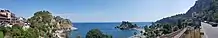 Isola Bella (Sicilian: Ìsula Bedda) is a small island near Taormina, Sicily, southern Italy. Also known as The Pearl of the Ionian Sea, it is located within a small bay on the Ionian Sea; it was a private property owned by Florence Trevelyan until 1990, when it was bought by the Region of Sicily, being turned into a nature reserve, administrated by the Italian branch of the World Wide Fund for Nature. There is a narrow path that often connects the island to the mainland beach. The island is surrounded by sea grottos and has a small and rather rocky beach which is a popular destination for sunbathers.