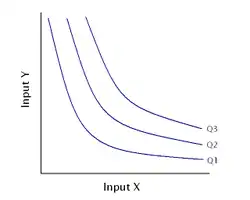 An isoquant (derived from quantity and the Greek word iso, meaning equal), in microeconomics, is a contour line drawn through the set of points at which the same quantity of output is produced while changing the quantities of two or more inputs.[1][2] The x and y axis on an isoquant represent two relevant inputs, which are usually a factor of production such as labour, capital, land, or organisation. An isoquant may also be known as an “Iso-Product Curve”, or an “Equal Product Curve”.