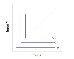 If the two inputs are perfect complements, the isoquant map takes the form of fig. B; with a level of production Q3, input X and input Y can only be combined efficiently in the certain ratio occurring at the kink in the isoquant. The firm will combine the two inputs in the required ratio to maximize profit.