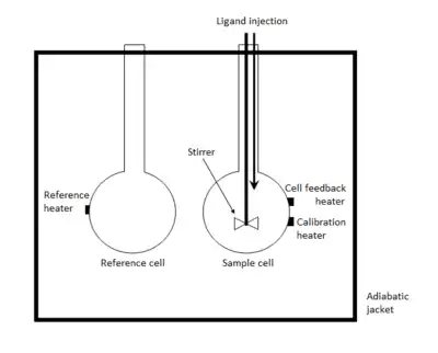An isothermal titration calorimeter is composed of two identical cells made of a highly efficient thermally conducting and chemically inert material such as Hastelloy alloy or gold, surrounded by an adiabatic jacket.[2] Sensitive thermopile/thermocouple circuits are used to detect temperature differences between the reference cell (filled with buffer or water) and the sample cell containing the macromolecule. Prior to addition of ligand, a constant power (<1 mW) is applied to the reference cell. This directs a feedback circuit, activating a heater located on the sample cell.[3] During the experiment, ligand is titrated into the sample cell in precisely known aliquots, causing heat to be either taken up or evolved (depending on the nature of the reaction). Measurements consist of the time-dependent input of power required to maintain equal temperatures between the sample and reference cells.