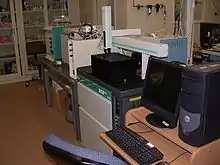 Moving wire IRMS is useful for analyzing carbon-13 ratios of compounds in a solution, such as after purification by liquid chromatography. The solution (or outflow from the chromatography) is dried onto a nickel or stainless steel wire. After the residue is deposited on the wire, it enters a furnace where the sample is converted to CO2 and water by combustion. The gas stream finally enters a capillary, is dried, ionized, and analyzed.[12] This process allows a mixture of compounds to be purified and analyzed continuously, which can decrease the analysis time by a factor of four.[12] Moving wire IRMS is quite sensitive, and samples containing as little as 1 nanomole of carbon can yield precise (within 1‰) results.[13]
