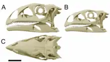 The paratype is specimen NHMD 164758, found in 1995 in the same layer. It consists of a skull with lower jaws, more complete than the holotype. It only lacks the rear right corner of the skull roof. It represents a medium stage juvenile, about a third shorter than the holotype. Both types are part of the collection of the Natural History Museum of Denmark. The three skeletons discovered in 2012, specimens NHMD 164734, GM.V 2013‐683 and NHMD 164775, were in 2021 not formally referred or described; the latter skeleton had even not been fully prepared yet. This limited the description to the head.[1]