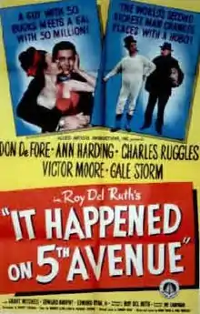 It Happened on 5th Avenue is a 1947 American comedy film directed by Roy Del Ruth and starring Victor Moore, Ann Harding, Don DeFore, Charles Ruggles and Gale Storm. Herbert Clyde Lewis and Frederick Stephani were nominated for the Academy Award for Best Story, losing to Valentine Davies for another Christmas-themed story, Miracle on 34th Street.