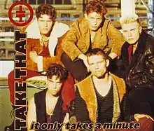 "It Only Takes a Minute" is a 1975 song by Tavares. The song was the group's only top-10 pop hit in the United States, peaking at number 10, and their second number one song on the American soul charts.[1] On the US Disco chart, "It Only Takes a Minute" spent five weeks at number two and was the first of four entries on the chart.[2] The song was subsequently covered by Jonathan King performing as 100 Ton and a Feather in 1976 and by boy band Take That in 1992.