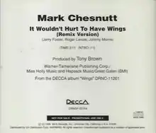 "It Wouldn't Hurt to Have Wings" is a song written by Jerry Foster, Roger Lavoie and Johnny Morris, and recorded by American country music artist Mark Chesnutt. It was released in December 1995 as the second single from the album Wings. The song reached number 7 on the U.S. Billboard Hot Country Singles & Tracks chart and number 4 on the Canadian RPM Country Tracks chart.