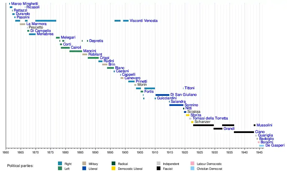 14 December 1869 | 20 November 1876 | 6 years, 342 days | Historical Right | Lanza Minghetti II |