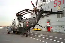 The air arm consists of a maximum of sixteen AV-8B Harrier IIs and two search and rescue helicopters, or eighteen Agusta helicopters or a mix of helicopters and fighters. The flight deck is the characteristic off-axis design with a 6.5 degree ski-jump for STOL aircraft; she is 174 m (571 ft) long and 30.4 m (100 ft) wide.[3]