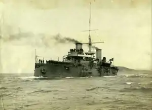 Varese, named after the Battle of Varese during the Second Italian War of Independence,[4] was laid down by Orlando at their shipyard in Livorno on 24 January 1898, launched on 6 August 1899 and completed on 5 April 1901.[5] The ship made port visits to Algiers on 14 September 1903 and Barcelona on 4 April 1904.[6] During the 1905 fleet maneuvers, she was assigned to the "hostile" force blockading La Maddalena, Sardinia.[7] Varese was present in Athens during the Intercalated Olympic Games in April 1906.[6] Together with her sister ships Francesco Ferruccio and Giuseppe Garibaldi, the ship was in Marseilles, France on 15–16 September 1906 to participate in a fleet review for Armand Fallières, President of France, on the latter date.[8] Under the command of Prince Luigi Amedeo, Duke of the Abruzzi, Varese was present at the Jamestown Exposition in May 1907.[9] The ship was assigned to the Levant from 1 October 1909 to 20 February 1910 and then based at Suda Bay, Crete from 23 August to 20 September 1911.[6]