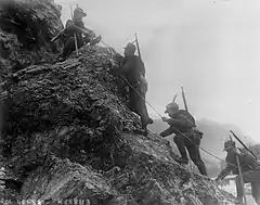 The Italian front or Alpine front (Italian: Fronte alpino, "Alpine front"; in German: Gebirgskrieg, "Mountain war") involved a series of battles at the border between Austria-Hungary and Italy, fought between 1915 and 1918 in the course of World War I. Following secret promises made by the Allies in the 1915 Treaty of London, Italy entered the war aiming to annex the Austrian Littoral, northern Dalmatia, and the territories of present-day Trentino and South Tyrol. Although Italy had hoped to gain the territories with a surprise offensive, the front soon bogged down into trench warfare, similar to that on the Western Front in France, but at high altitudes and with very cold winters. Fighting along the front displaced much of the local population, and several thousand civilians died from malnutrition and illness in Italian and Austro-Hungarian refugee-camps.[8] The Allied victory at Vittorio Veneto, the disintegration of the Habsburg empire, and the Italian capture of Trento and Trieste ended the military operations in November 1918. The armistice of Villa Giusti entered into force on 4 November 1918, while Austria-Hungary no longer existed as a unified entity. Italy also refers to the Great War as the Fourth Italian War of Independence, which completed the last stage of Italian unification.[9]