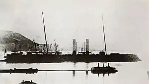 Affondatore sank in a storm in Ancona harbour on 6 August 1866,[2] which may have been due to damage received during the Battle of Lissa.[16] According to naval historians Greene and Massignani, however, Affondatore merely took on too much water due to her low freeboard; the damage sustained at Lissa had nothing to do with her sinking.[17] She had been refloated by 5 November.[18] After refloating, Affondatore was rebuilt at La Spezia from 1867 to 1873. The ship's masts and sails were removed, with a single mast carrying a fighting top fitted in their place.[2] In 1883–1885, she was fitted with new boilers and engines, rated at 3,240 indicated horsepower (2,420 kW),[2] and giving a speed of 13 knots (24 km/h; 15 mph).[19] During the annual fleet maneuvers held in 1885, Affondatore served in the 2nd Division of the "Western Squadron"; she was joined by the ironclad Roma and five torpedo boats. The "Western Squadron" attacked the defending "Eastern Squadron", simulating a Franco-Italian conflict, with operations conducted off Sardinia.[20]