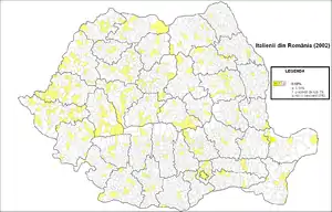 They are an ethnic minority in Romania, numbering 3,203 people according to the 2011 census. Italians are fairly dispersed throughout the country, even though there is a higher number of them in some parts of the country (particularly Suceava County, Bacău County, Galați County, Iași County, Constanța County, Brașov County, Prahova County, Vâlcea County and Timiș County), and in the Municipality of Bucharest.