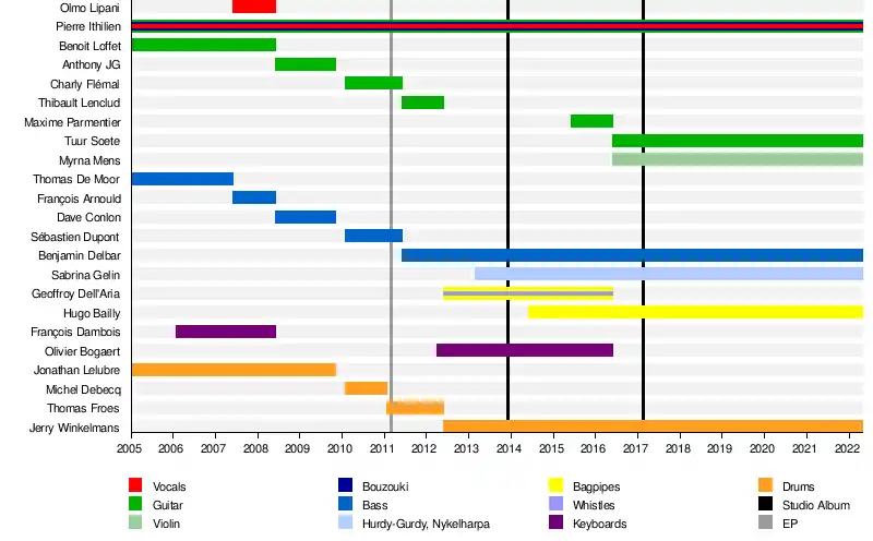 Over time, other members were added such as Hugo Bailly to the bagpipes and Sabrina Gelin to the hurdy-gurdy, both in 2014. An even more privileged place is then made to the folkloric instruments within the band.[9]