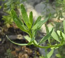 Iva hayesiana is a shrubby perennial herb approaching one meter (40 inches) in height. Its green oval-shaped leaves are fleshy, glandular, aromatic, and 3 to 6 centimeters (1.2-2.4 inches) long.[2]