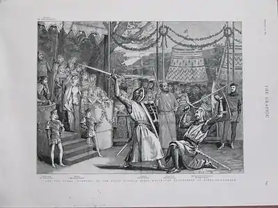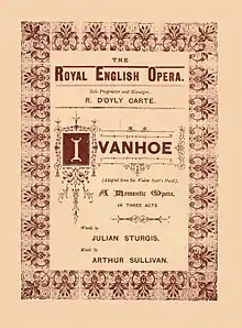 Ivanhoe is a romantic opera in three acts based on the 1819 novel by Sir Walter Scott, with music by Sir Arthur Sullivan and a libretto by Julian Sturgis. It premiered at the Royal English Opera House on 31 January 1891 for a consecutive run of 155 performances, a record for a grand opera.[1] Later that year it was performed six more times, making a total of 161 performances.[2] It was toured by Carl Rosa Opera Company in 1894–1895 but has rarely been performed since. The first complete, fully professional recording was released in 2010 on the Chandos Records label.[3]