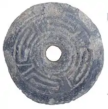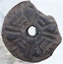 The other functional possibility, that considered them as beads or hanging decoration, is somewhat complex to analyze, considering these are disks with perforated center holes and not precisely on its edges, as they could easily hung as necklace beads and pendant disks.[27] In fact, the rodelas could have functioned as necklace beads, on a necklace that used on edge rather than front position. In other words, is a peculiar ornament, but not impossible to do.[28]