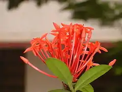 Ixora coccinea (also known as jungle geranium, flame of the woods or jungle flame or pendkuli) is a species of flowering plant in the family Rubiaceae.[1] It is a common flowering shrub native to Southern India, Bangladesh, and Sri Lanka. It has become one of the most popular flowering shrubs in South Florida gardens and landscapes.[2] It is the national flower of Suriname.