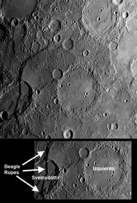 Izquierdo is a crater on Mercury located to the east of Beagle Rupes and Sveinsdóttir crater. The floor of Izquierdo is smooth, the result of having been partially filled with volcanic lava. Circular outlines of the rims of “ghost craters” – smaller, older craters that have been largely buried by the lavas that infilled the basin – are visible in a few places on Izquierdo's floor. The remnants of a buried inner ring are also barely discernible in spots. There have been more recent impacts into the floor of Izquierdo, resulting in some small, sharply defined craters.[1]