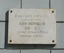 Józef Piotrowski was born in 1840 in Poland, which for that time was in Russian Empire. For the participation in January Uprising he was sentenced to exile to Siberia and later to Perm. In winter of 1863 he opened a bookshop, registering it in the name of his wife, Olga Platonovna Petrovskaya. The shop was situated at the crossing of Pokrovskay Street and Sibirskaya Street. The Petrovsky Shop won popularity among the inhabitants and promoted the development of education in Perm. It was also used for underground distribution of democratic literature, which influenced on the formation of revolutionary opinions among the youth. This is testified by the documents of Petrovsky family kept in Perm Krai Museum. A memorial table is installed on the building where was the bookshop situated.[1][3]