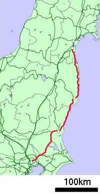 The Jōban Line (Japanese: 常磐線, Japanese pronunciation: [Jōban-sen]) is a railway line in Japan operated by the East Japan Railway Company (JR East). The line officially begins at Nippori Station in Arakawa, Tokyo before the line officially ends at Iwanuma Station in Iwanuma, Miyagi.[1] However, following the opening of the Ueno–Tokyo Line, Jōban Line train services originate at Shinagawa or Ueno; likewise, Jōban Line trains continue past Iwanuma onto the Tōhoku Main Line tracks to Sendai.[2] The line approximately parallels the Pacific coasts of Chiba, Ibaraki, and Fukushima Prefectures.