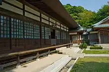 After the main gate (sanmon) in the middle of the temple's large garden stands the Main Hall (the Hon-dō, see photo above). Its structure is however not that of a typical Zen Butsuden, but rather that of an 8×6 bay (間, ken) hōjō (chief priest's living quarters) with raised floors.[2] Destroyed by fire in 1748, it was rebuilt in 1754 using in part original Muromachi period timber salvaged from the old edifice.[2] The main object of worship is a seated figure of Shaka Nyorai carved in wood during the Nanboku-chō period.[2] The temple also owns a seated figure of founding priest Taikō Gyōyū (the temple's only Important Cultural Property), a statue of goddess Shō-Kannon, another of Fujiwara no Kamatari (an ancestor of the Fujiwara clan), and one of Kōjin, the god of the kitchen and cooking.[2] The hōkyōintō in the cemetery behind the Hon-dō is said to be Ashikaga Sadauji's grave, but the attribution has been questioned by scholars because of the date it bears, sixty years after Sadauji's recorded date of death.[2] The temple includes a recently restored tea house called Kisen-an (喜泉庵) where monks used to meet to have tea, but which is now open to the public. In front of the tea house lies a karesansui, or Zen rock garden. On the premises there is also a restaurant and bakery owned and operated by the temple itself. Near the temple can be found the ruins of Daikyū-ji (大休寺), Ashikaga Tadayoshi's family temple (he was often called Daikyū-dono (大休殿)) where he was buried after he died.