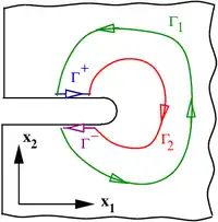 Figure 2. Integration paths around a notch in two dimensions.Consider the contour . Since this contour is closed and encloses a simply connected region, the J-integral around the contour is zero, i.e.